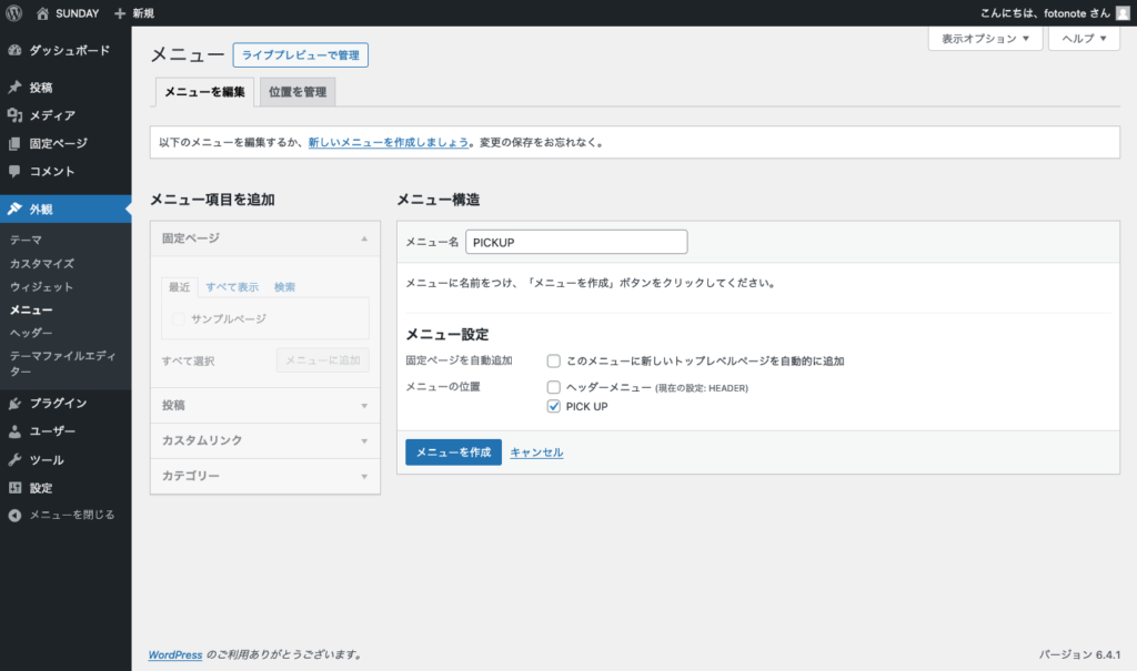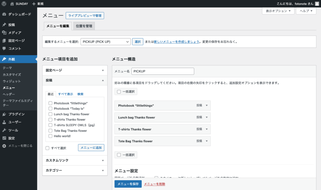 掲載したい投稿記事を選択のうえ、「メニュー設定」>「PICK UP」を選んで保存します。