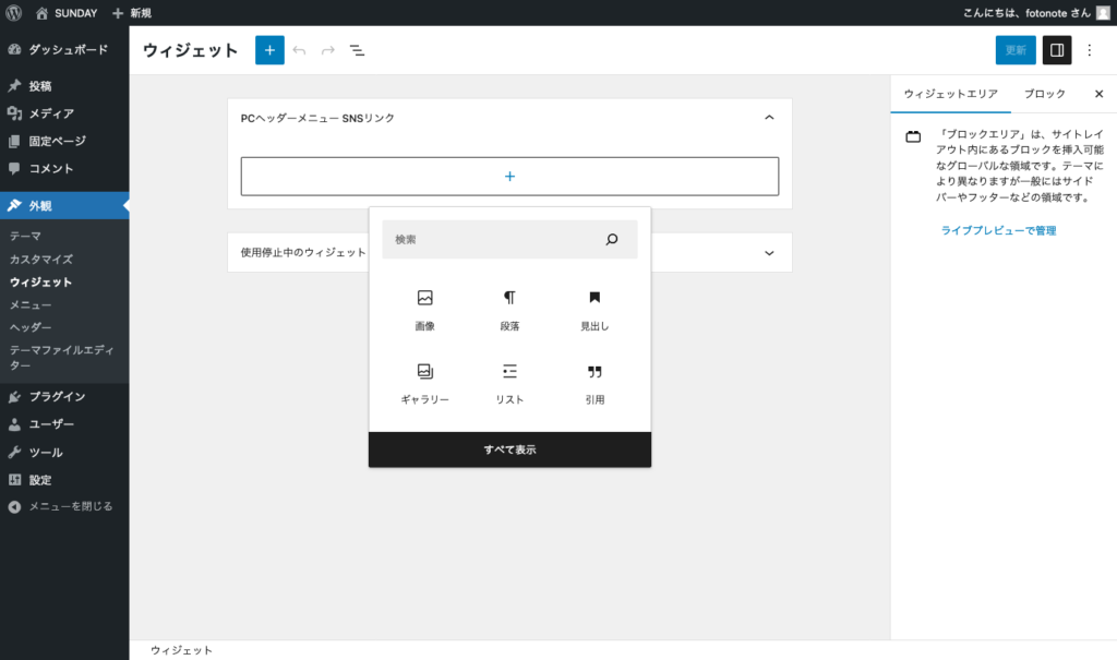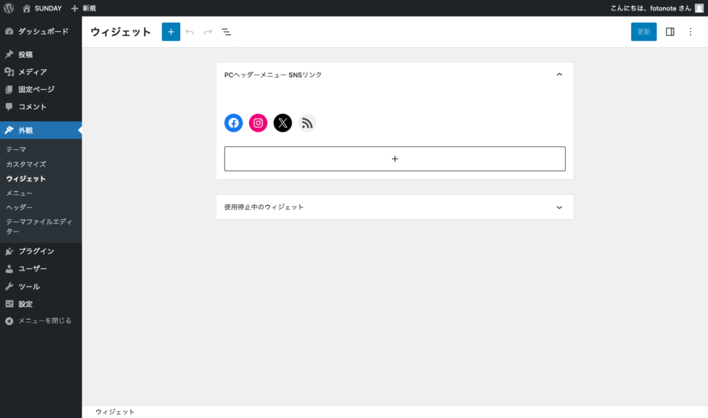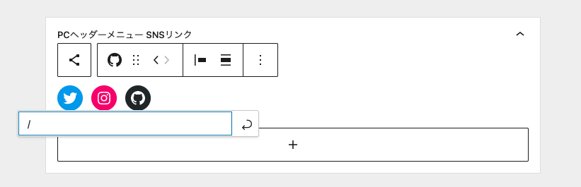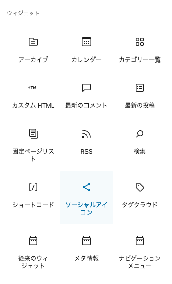 ヘッダーの右上にSNSのアイコンとリンクを設置できます。 設定方法 「ウィジェット」の「PCヘッダーメニュー SNSリンク」から登録します 「ソーシャルアイコン」を探してください SNSアイコンをクリックしてえらびます リンクのURLを設定します