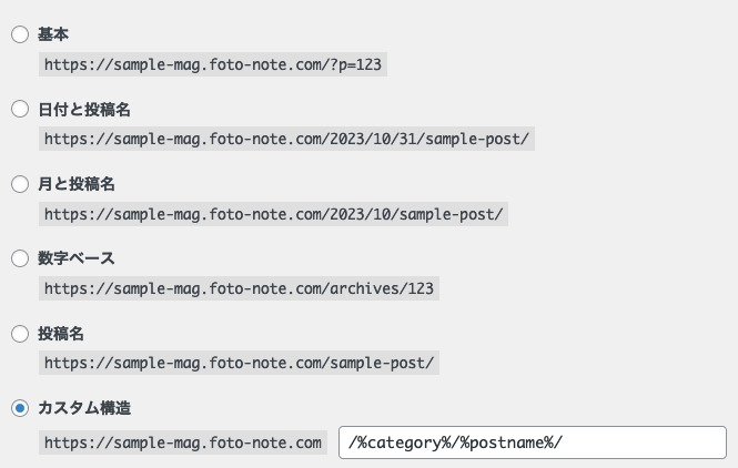 「カスタム構造」を選択のうえ、「category」「postname」を選んで保存します。